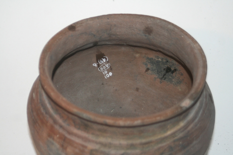 A good classic Upchurch pot of the Slayhill / Milfordhope type. Globular shaped vessel with inverted rim and shallow cordon below the neck. AD.90-120. Understood to have been found in Chatham New Road in the early 1970s