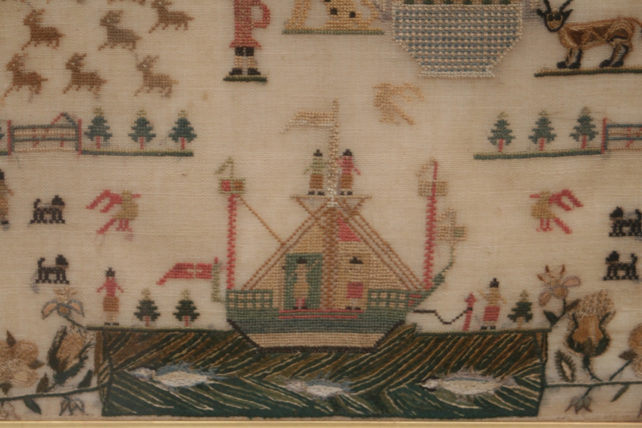 An exceptional silk sampler that has everything House boat fish animals and farmers all worked in a very fine and unusual floral border.