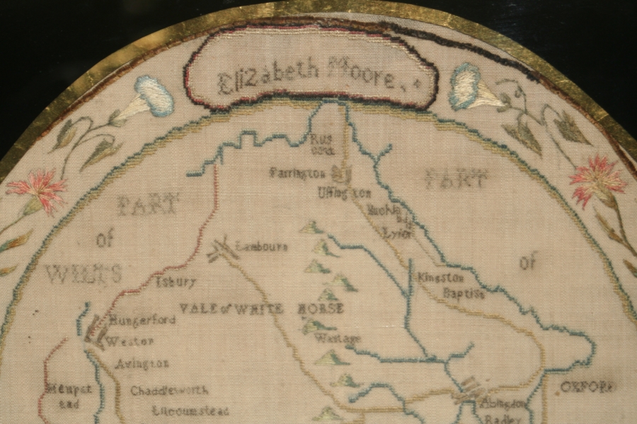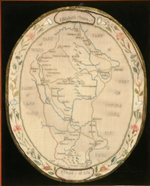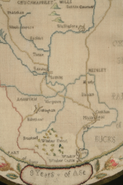 A very rare late 18th or early 19th century map of the Country of Berkshire. Needlework country maps are very rare, this particular example has interesting images of the hills and other geographical features within the country.