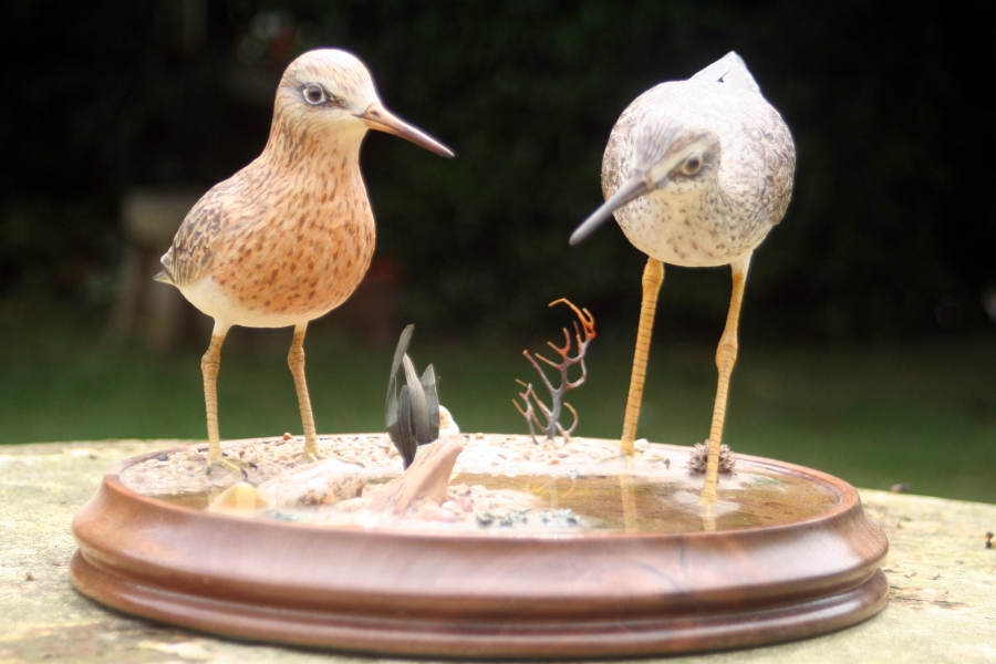 . don't know when a carved decoy becomes fine art or when fine art becomes a decoy. These exquisitely carved shore birds are placed in a naturalistic environment including shells and seaweed with clear resin forming the water. I think they represent a Dunlin and Snipe ,