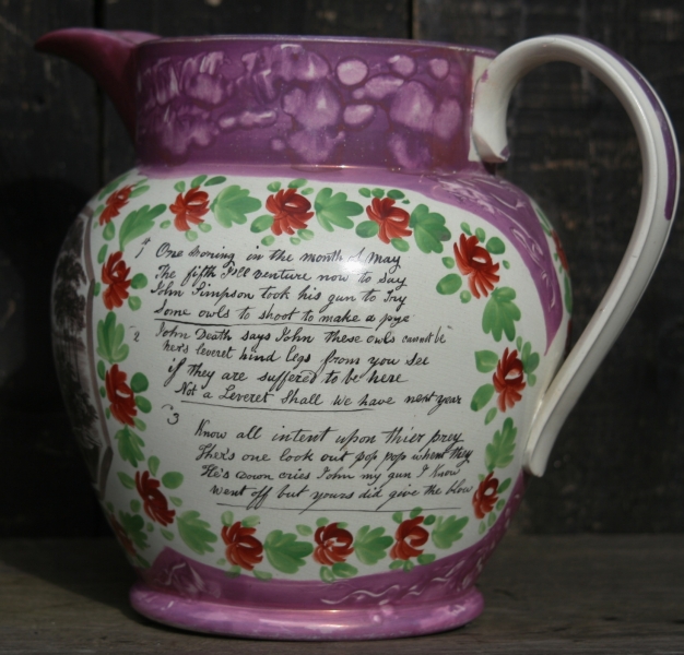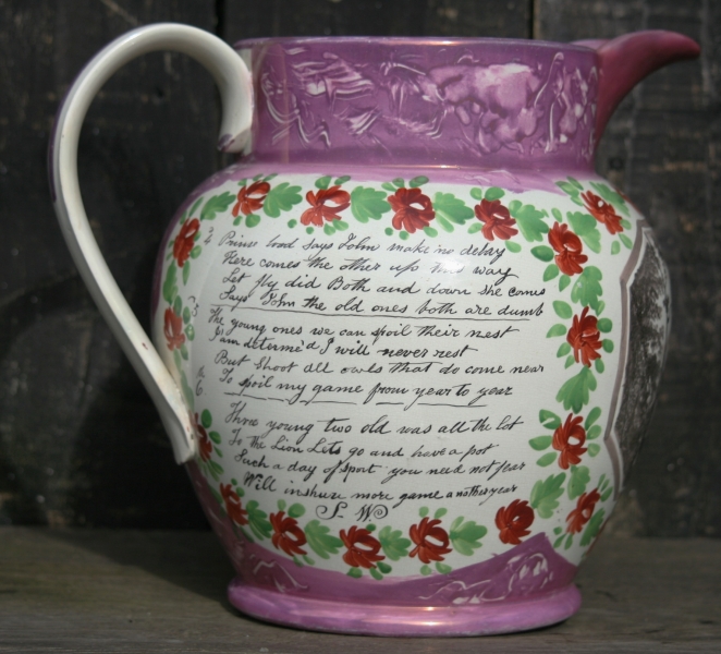 This is a unique and impressive jug standing 24 cm tall at the spout, hand painted with a verse about shooting owls.Restored chip to spout, well done.