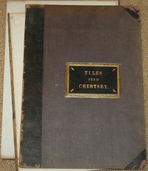 A very rare large format book. TILES FROM CHERTSEY; Tiles from Chertsey Abbey Surry, formed the pavement . From drawings by Mr Manwaring Shurlock. 41 coloured plates of medallions representing the chief incidents relating to the Romance Poems "Richard Coeur de Lion" and Sir Tristrem are drawn full size.