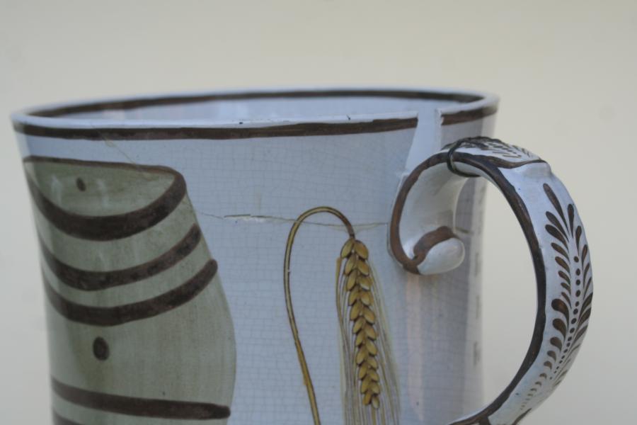 A Yorkshire Double-Handled Eshaldwell Brewery Pearlware Pottery Mug, 1829, probably Swillington Bridge Pottery near Leeds, the cylindrical body printed and painted on one side with beer barrel, fruiting hops and a barley ear, on the other with four line verse ESHALDWELL BREWERY, IS KNOWN VERY WELL/FOR BREWING GOOD ALE NONE CAN IT EXCEL/PAY OFF YOUR OLD SCORES AND ORDER AGAIN/FOR I'M SURE OF THE ALE YOU CANNOT COMPLAIN, 1829, within floral sprays, with brown line detail and moulded basal horizontal ribbed band, 19cm high, 33.5cm wide across handles Mugs and beer jugs of this type are known and presumably come from the Woodlesford area in Yorkshire. It is probably that Bentley Eshaldwell Brewery in Aberford Road, Woodlesford, founded 1828, commissioned these vessels for advertising purposes and promoting the Brewery's ales. This brewery was absorbed by Whitbread Breweries in 1968, and was subsequently closed in 1972. |