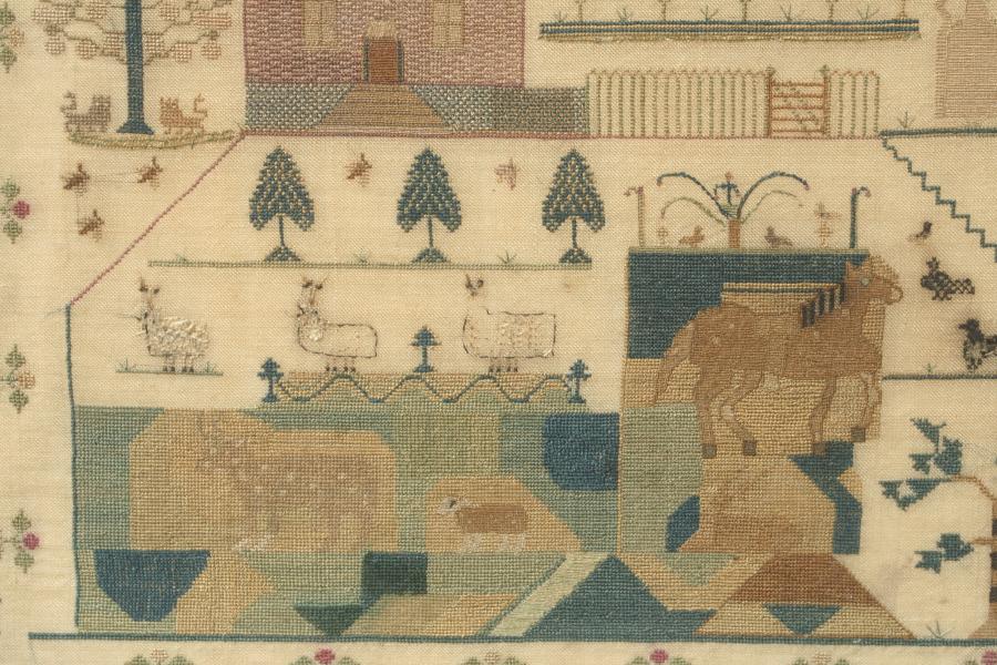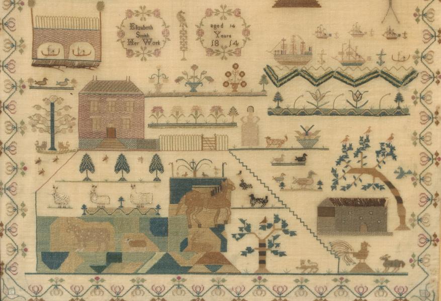 .An exceptional sampler by Elizabeth Smith dated 1814, depicting just about everything, including her farmhouse with a large naturalistic horse, ships and boats under a bridge.