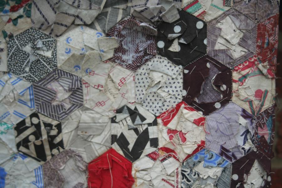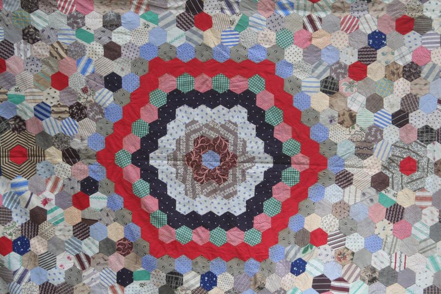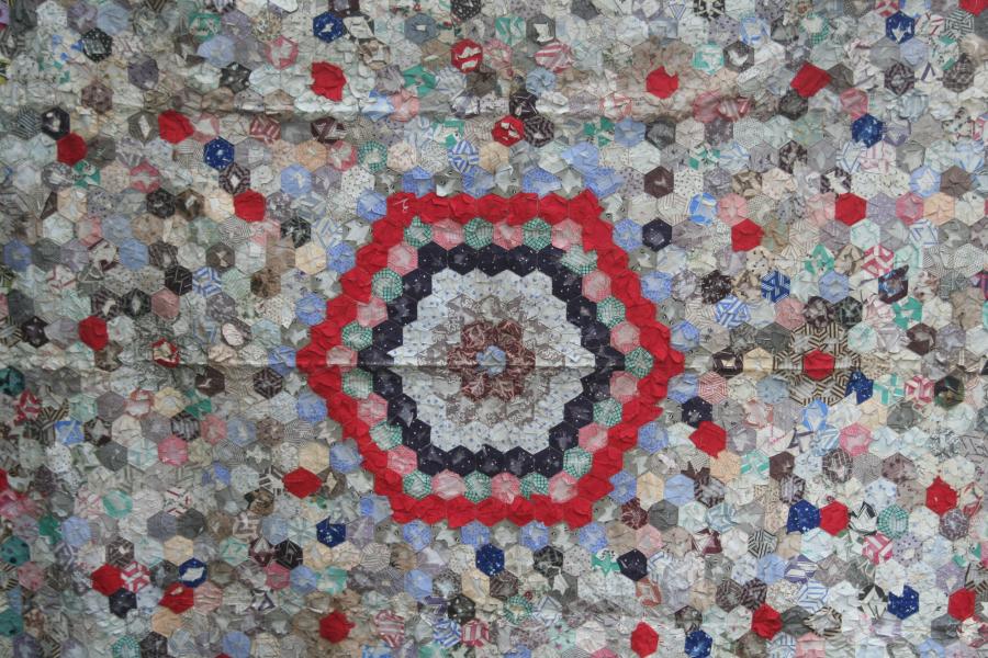 A good mid 19th century patchwork quilt, retaining original paper patterns with great calligraphy