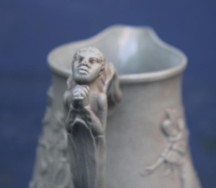 A rare 19th century Ridgway & Abington pottery relief moulded jug depicting a scene of Slave Selling with an Auctioneer on a Rostrum to which is attached a notice inscribed 'By Auction This Day. A Prime Lot of Healthy Negroes'. The reverse with a scene of the Escape of Eliza from Uncle Tom's Cabin. The handle surmounted by a Negro Boy praying. Impressed to base Ridgway & Abington, Hanley, January 1st 1853. (6.25 inches). |