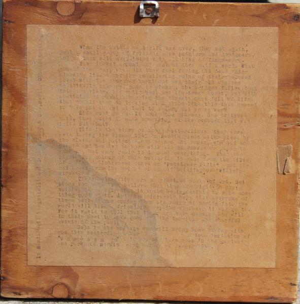 : : : This is the story of these butterflies: they were made during the summer 1945 in Berlin piece after piece by the clever and patient hands of men and women, who had no paints and brushes to work with and no canvas or paper to work on, but were ready to do most everything. Thus the light blue colour of this butterfly is made from the tiles of a fine delicatessen store on "Potsdamer Platz" and the red brown from the bricks of an old building of "Wilhelmstrasse".