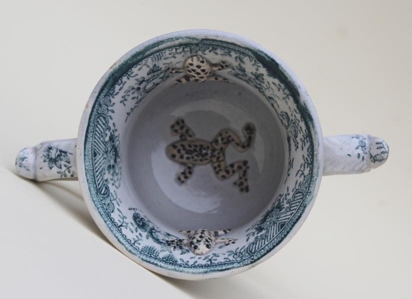 Oh what a delightful story this mug can tell. made to commemorate the birth of John Henry on July 14 1856 . Transfer printed in green with three frogs moulded on the inside.