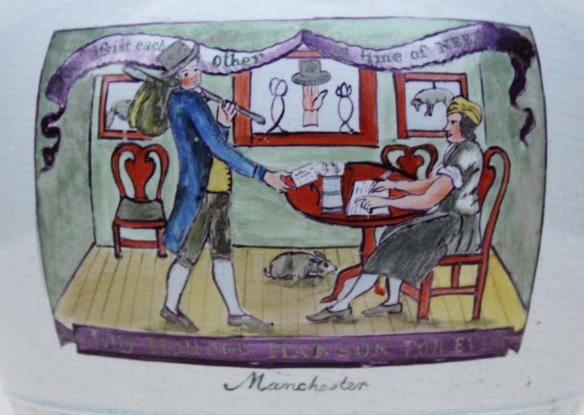 Now in 1810 Manchester was the center of the textile industry and, in that year there was considerable tension between the mill owners and spinners that resulted in the great Strike the following year. The jug shows a gentleman handing over a pledge to the seated worker , who is looking up his name on a list ! , in the background we have framed images of the Hatters, Glove makers, Wool merchants and the rabbit possibly representing the farriers ?. I think this jug is showing, to those in the know, that the trades are united , against the Mill owners. The other side as an image of Charity , they could all drink to her .