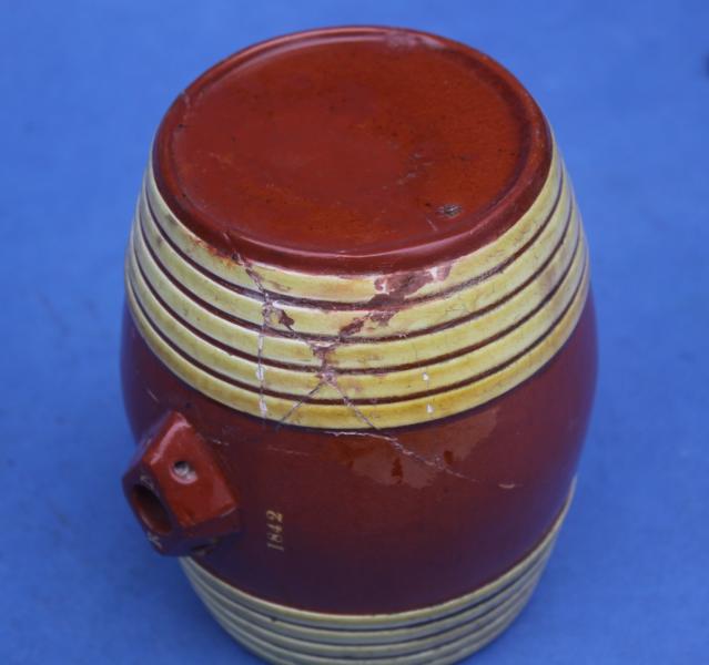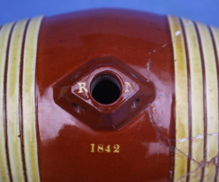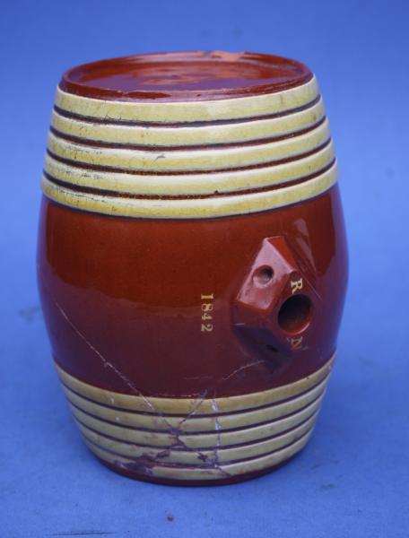 A very rare incised named and dated slipware barrel from Sussex,. The classic red clay body has bands of yellow slip around each end to look like the willow on a wooden barrel. Around the stopper at the top we have the initials RN incised into the clay, below this the date 1842. This form of decoration is characteristic of the Sussex potters around Rye.
