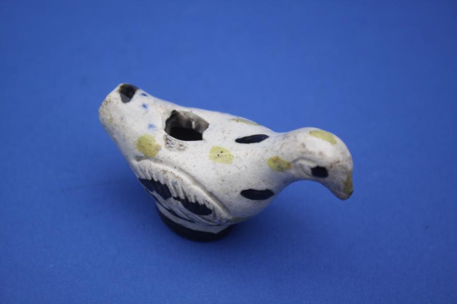 A rare early 19th century pearlware bird whistle decorated in Pratt like colours.