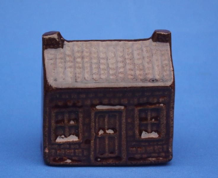 A charming small cottage bank, slip moulded and decorated in a treacle glaze.