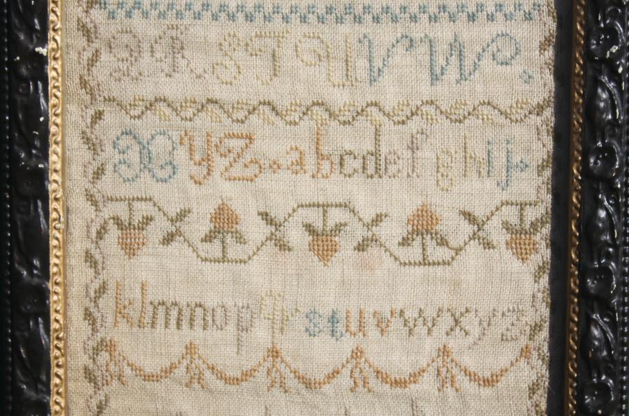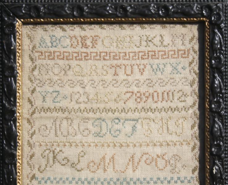 This sampler has a wonderful grace and warmth worked with the alphabet in both upper and lower case letters with simple border patterns between the lines, that include an unusual garland pattern. Framed in what appears to be its original black moulded frame measuring 25.5 x 49 cm.