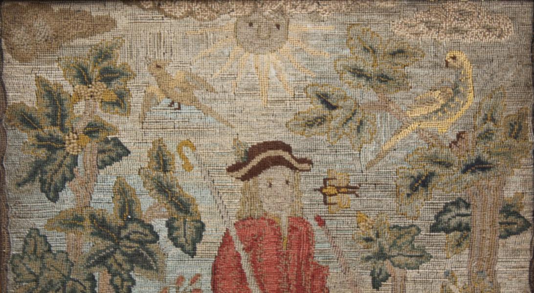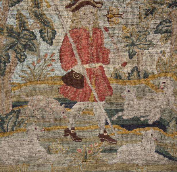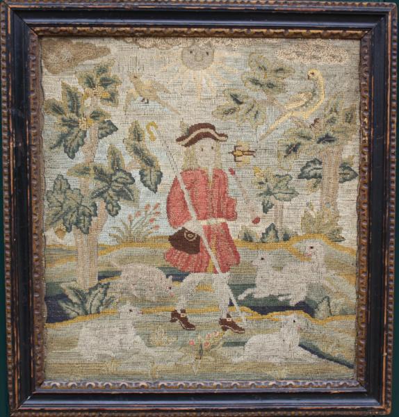 Maybe it because i'm a Shepherd now, that I love this early 18th century tent stitch needlework of a very smart Shepherd with handbag ! and flute, the Sun smiling down, on his well behaved flock.