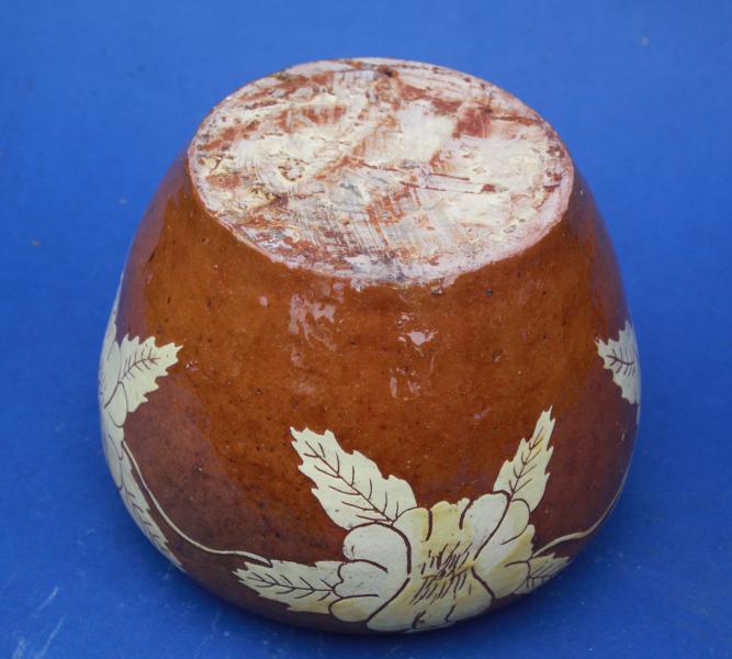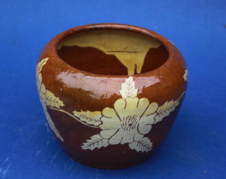 A rare and unusual late 19th century Slipware Jardinière decorated with a repeated pattern of flower heads in cream slip against a red / brown ground.