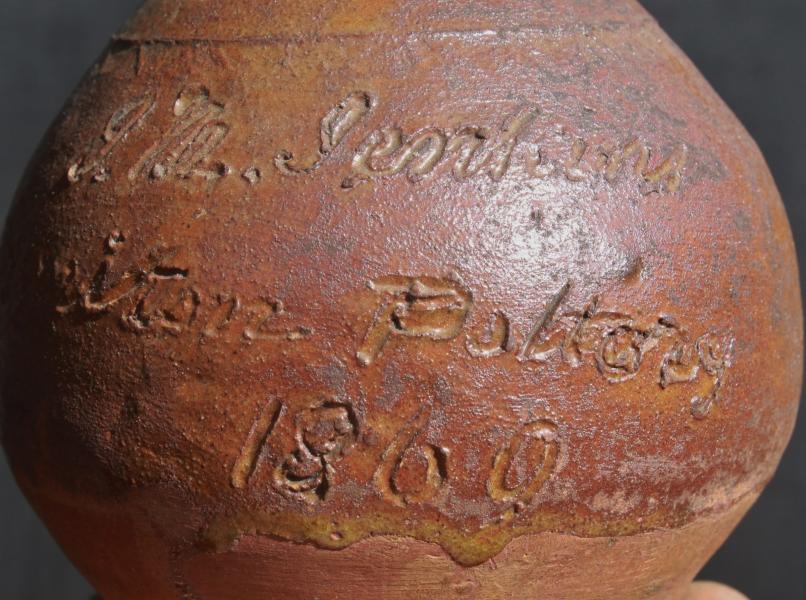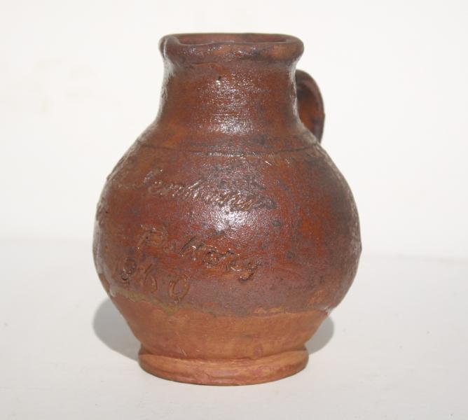 small jug, of the form produced in Devon at Honiton from the 17th to the late 19th century. This inscribed J.M.Jenkins , Honiton pottery 1869.