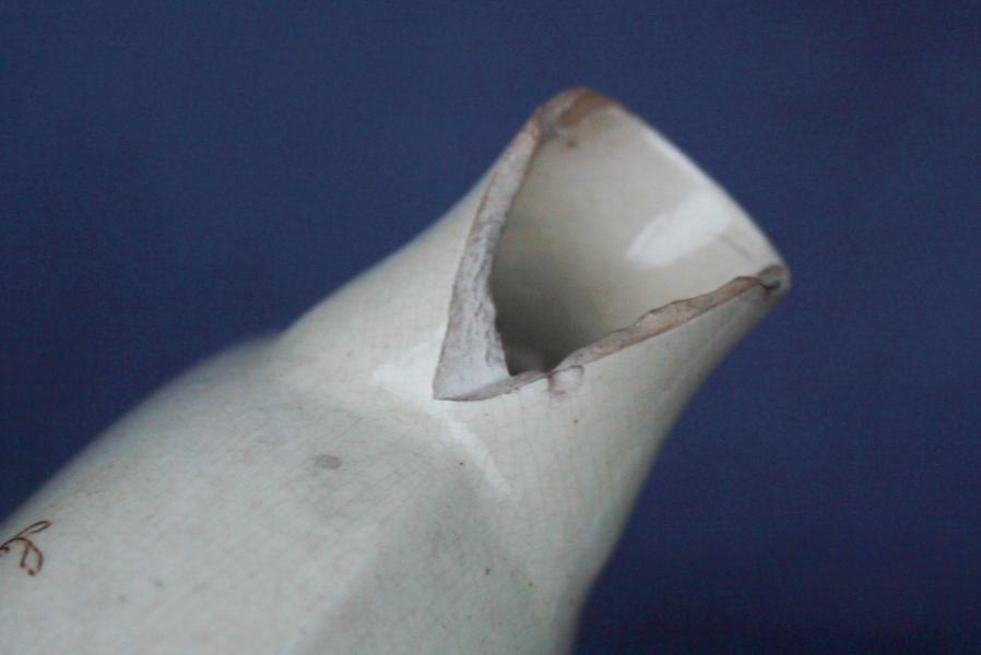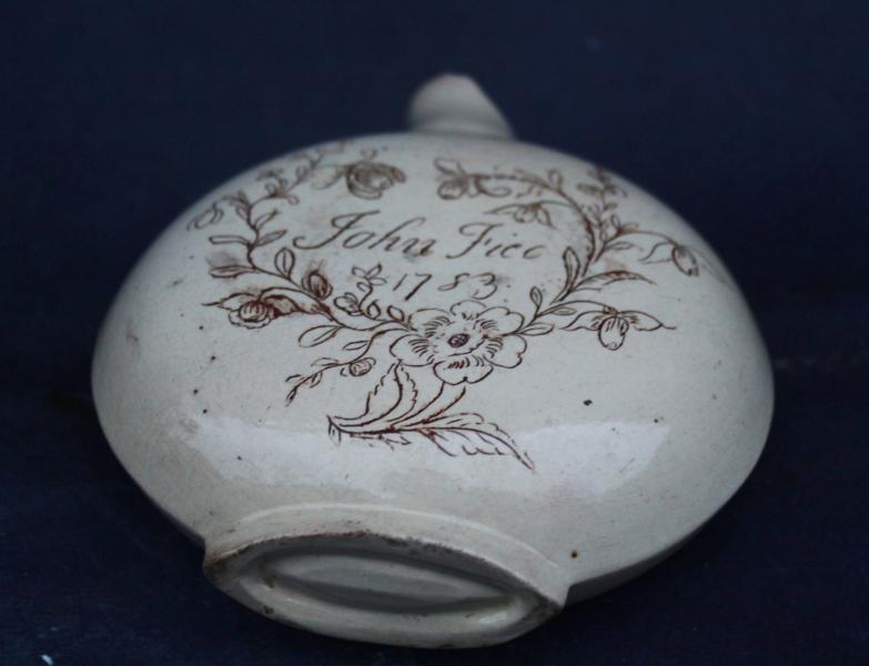 A very rare and interesting South Devon Slipware flask inscribed John Fice 1783. (An uncommon name) Possibly a Miller from Modbury who took on an apprentice Sarah Row in 1797. I would have preferred it to be a John Fice a British soldier who fought in The Samuel Drake Regiment in the US war from 1775 and retired in 1783.