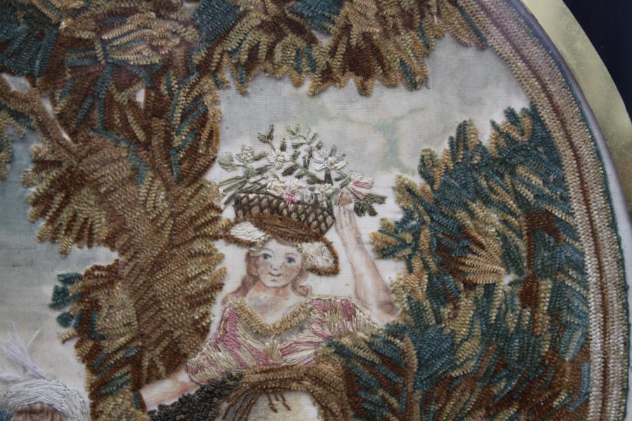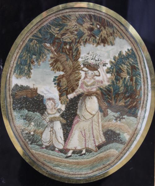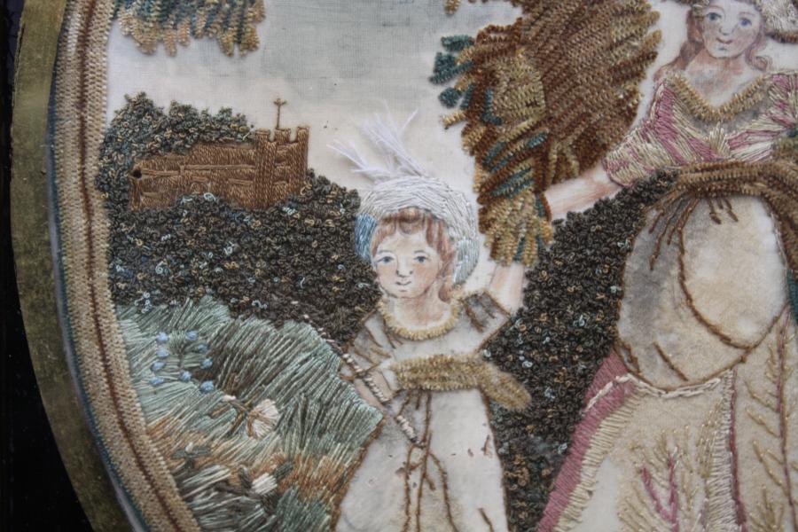 A fine Georgian silk needlework picture, depicting a Mother & child walking towards a church. Worked in bright coloured silks with some chenille work for the tree on the right and hedge behind the child. as well as fine felt for their dress . The faces hand painted on silk.