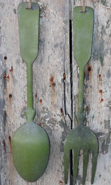 A wonderful oversize folk & spoon. Aluminium with wonderful green decoration.