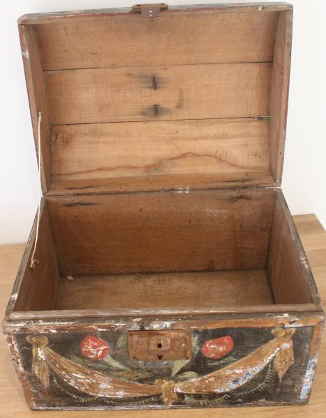 A good early 19th century Normandy marriage box decorated with naïve swags and flowers against a dark blue ground.