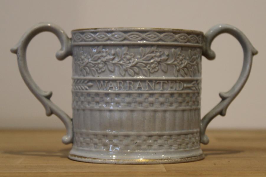 A very rare and unusual form, Usually in an earthenware pearlware body often attributed to Fell although other makers made them I have not come across a solid blue body nor a loving cup containing a blue frog.