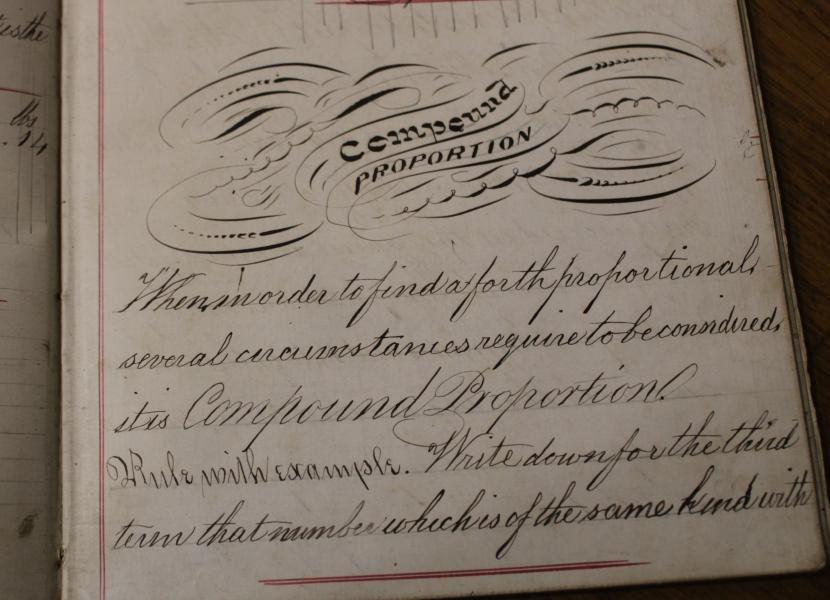 A wonderful school math's book signed to the front Thomas Haigh's 1871 with fine calligraphy swan titles, and pages of written work. many giving an insight to 19th century life...