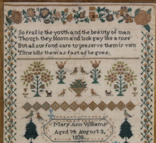 A delightful sampler that has it all, a different border has been worked across the top & bottom to the sides, a short verse across the top and numerous spot motifs. At the bottom a large Adam & Eve stand beneath the apple tree that its self has a garland of leaves over it. Either side a red house and a farmer with his cow, possibly a representation of Mary's home and fathers work.