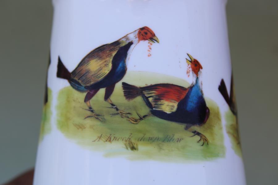 A rare and unusual jug depicting COCK FIGHTING SCENES features six polychrome images of a pair of cockerels fighting. Each image has a separate title and position: A Set, A Knock Down Blow, A Rally, Heeling, The Death. One of the titles is not clearly visible. The pitcher has gilt highlights around the rim, base, top and handle. A highly unusual item ideal for collectors of antique British pottery.