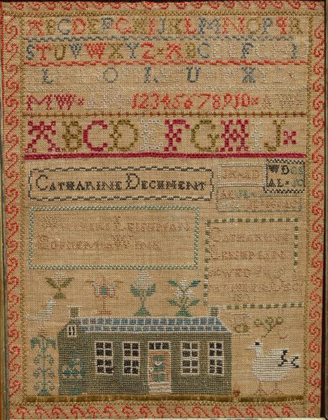 Catherine Leishman sewed this sampler Dec.1831. She highlights her mothers name Catherine Dechmont in black letting us know she had died, and her fathers details William & her stepmothers name Euphemia Wink .(both having three children).