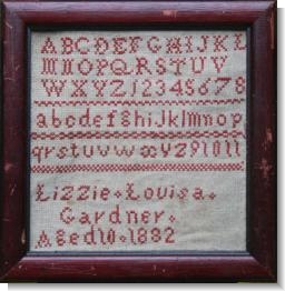 A delightful small Red & White School room sampler by Lizzie Louisa Gardner Aged 10 in 1882.
