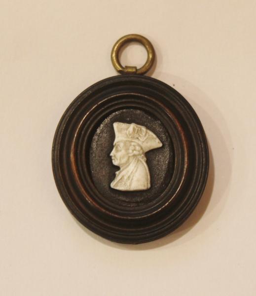 Frederick the Great, Portrait Plaque, white glass, circa 1800, after Tassie, profile portrait of Frederick wearing tricorn hat profile left.