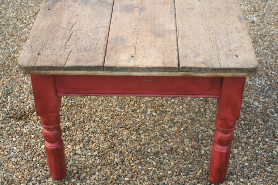 Here we have a 19th Century pine kitchen table with old scrubbed top of great colour. The base and legs painted in barn red over a light blue.