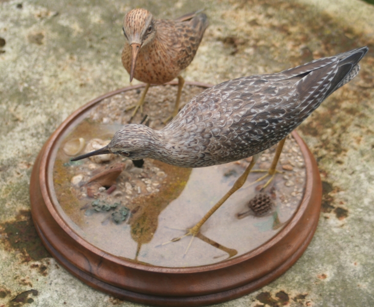 . don't know when a carved decoy becomes fine art or when fine art becomes a decoy. These exquisitely carved shore birds are placed in a naturalistic environment including shells and seaweed with clear resin forming the water. I think they represent a Dunlin and Snipe ,