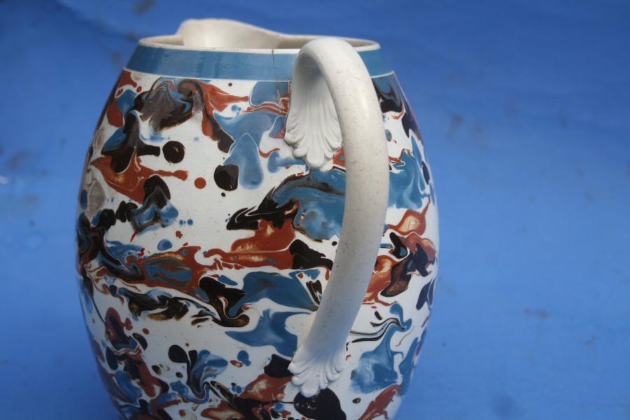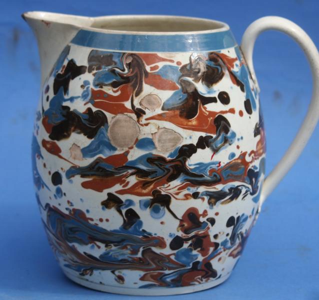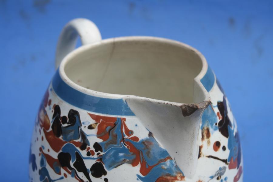 Condition, unrestored. some flaking to side. Damage around spout and a short crack near handle.