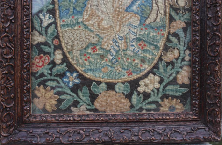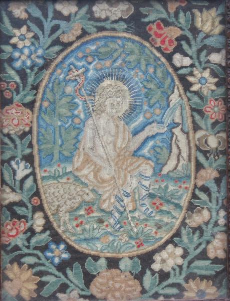 A wonderful canvas worked panel , depicting John The Baptist in a central oval, surrounded by a border of flowers against a black ground.