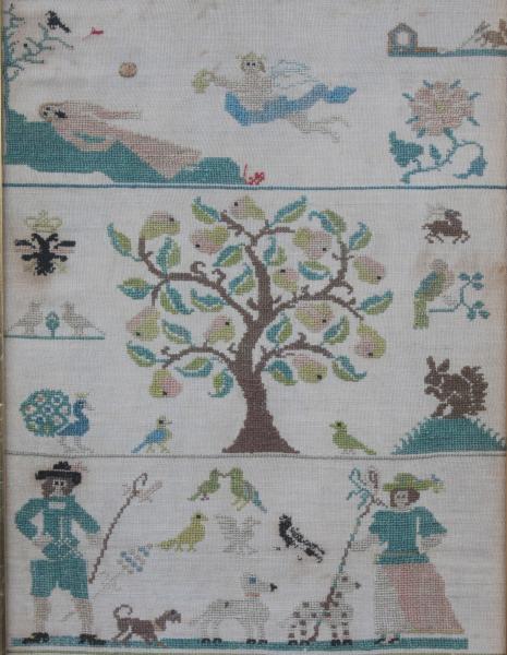 A stunning mid 18th century German band sampler worked with various biblical scenes including a central crucifixion, Jacobs Dream, Shepherd and a large pear tree. Signed CSB and dated 1758.