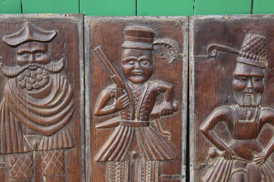 .Rare and interesting set of four carved panels probably representing a local Militia each holding a different weapon.