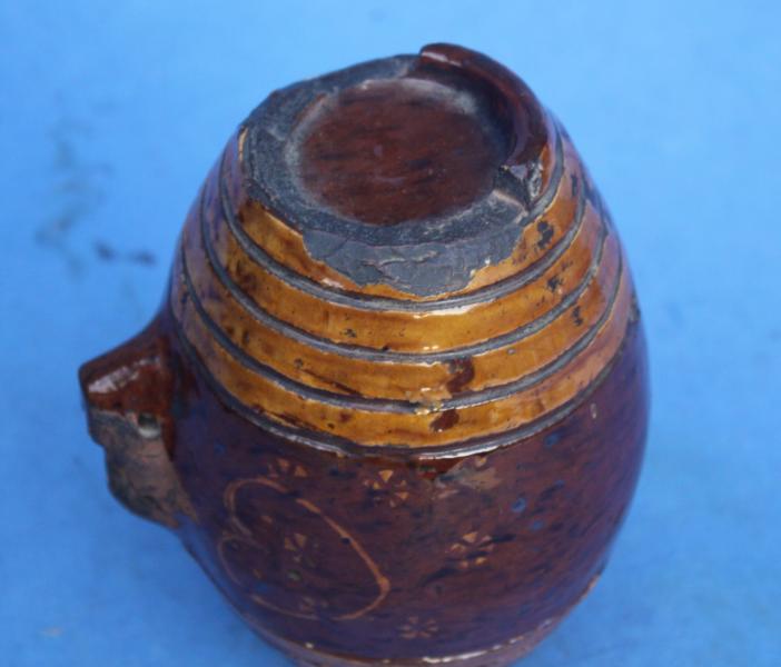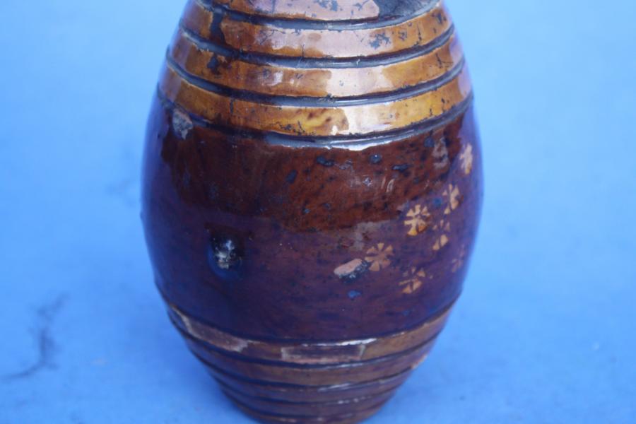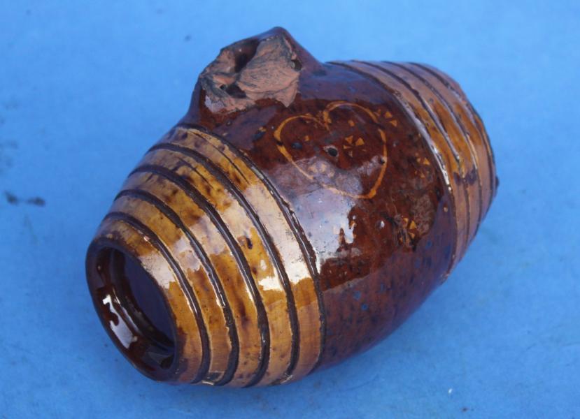 A wonderful late 18th century slipware barrel, with incised decoration to both sides in the form of hearts.