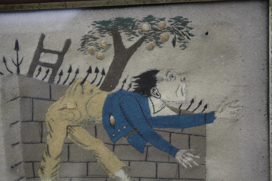A very unusual and amusing mid 19th century Felt needlework picture depicting a young gentleman caught on railings having fallen off his ladder while pinching apples.