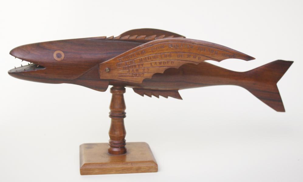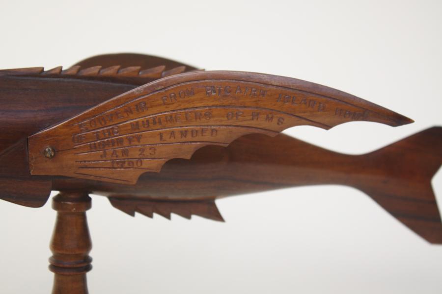 A lovely classic carved fish by JACOB WARREN signed on one wing, the other with full inscription Souvenir from Pitcairn Island home of the mutineers of HMS Bounty landed Jan 23 1790.Length 15 inches 38 cm