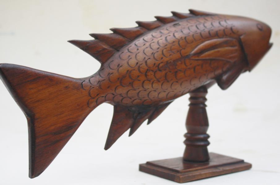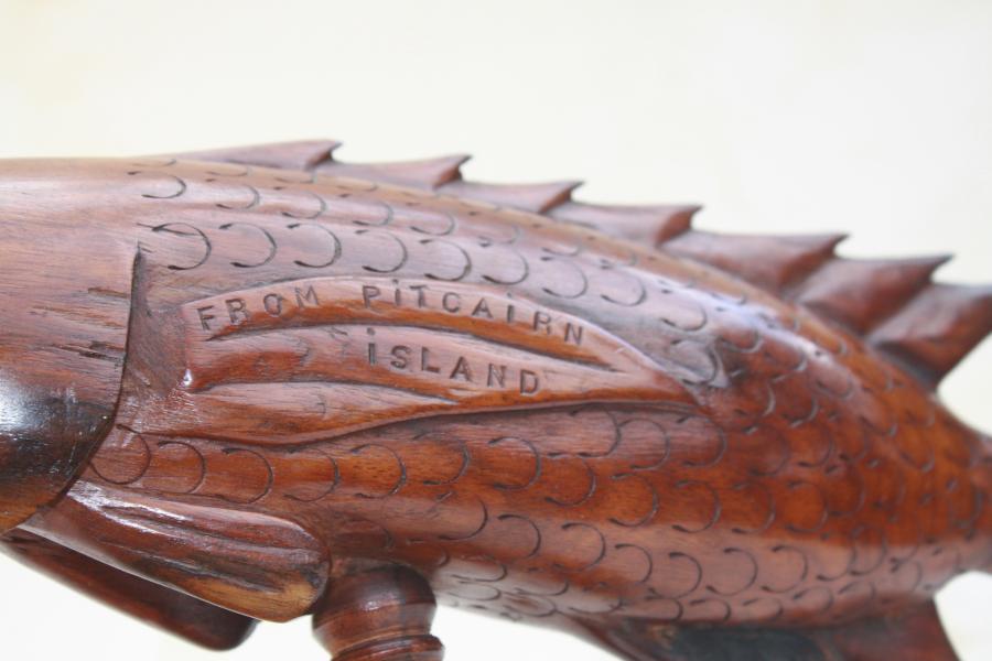 interesting fish inscribed to the side in the traditional style FROM PITCAIRN ISLAND, the other side blank. Old paper label has the name COLIN HALL. Pitcairn Island .