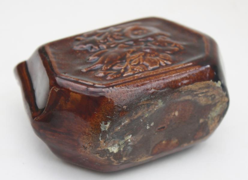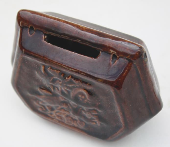 Produced in a treacle glaze possibly by the wooden box factory with raised fielded panels to each side. suspension holes for a hanging cord just help.