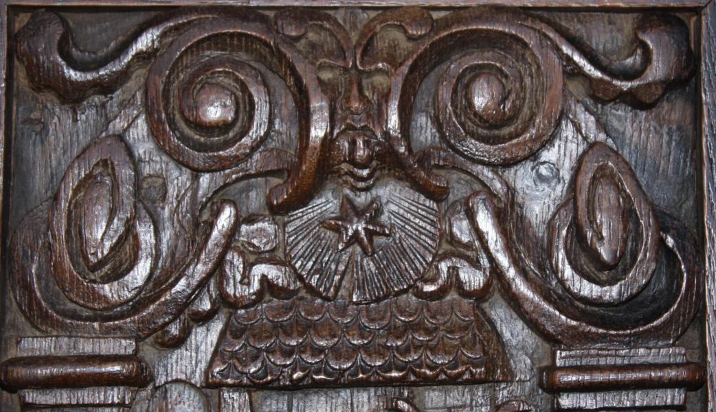 Flemish Nativity panel circa 1600, interesting Grotesque head amoungst the clouds , love the lantern.