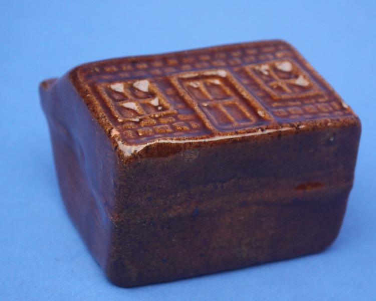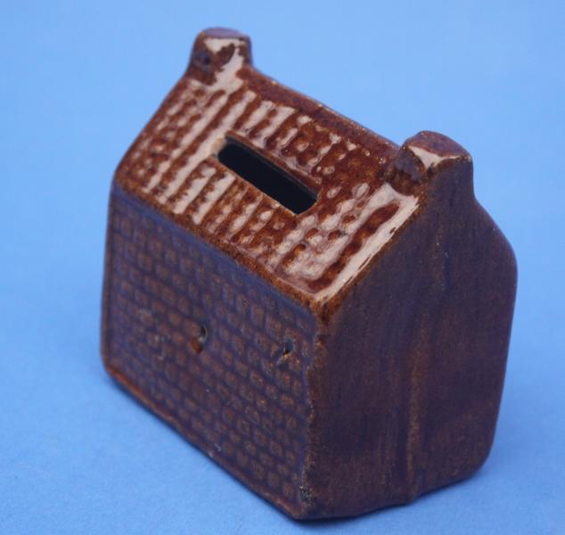A charming small cottage bank, slip moulded and decorated in a treacle glaze.