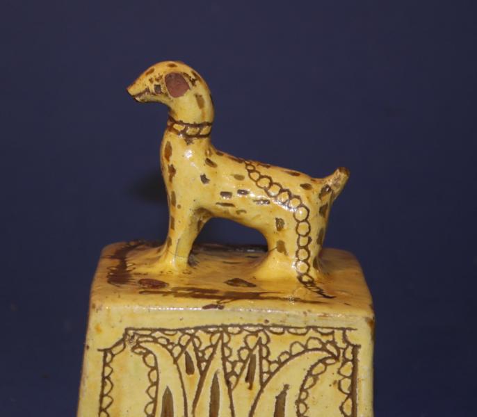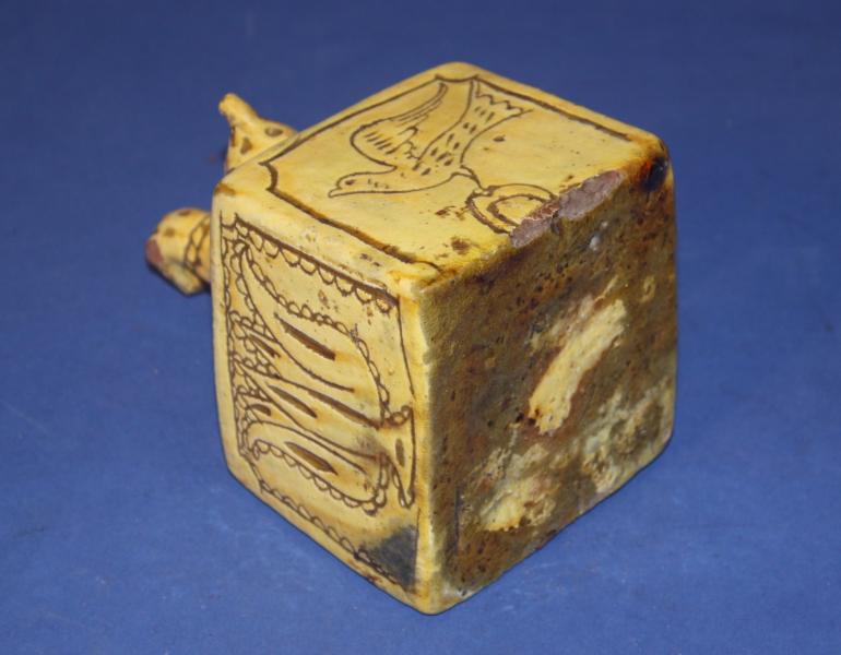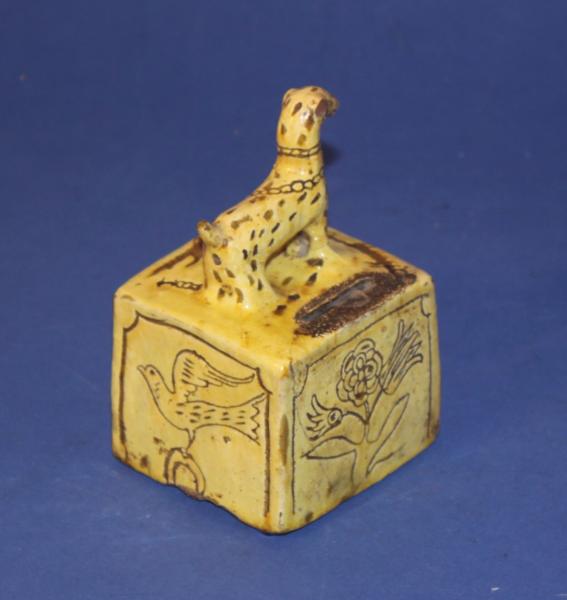 It has been brought to our notice of another similar money box dated 1795 and inscribed to a different girl, this lacks the dog figure (lost) and was found in a river in North Devon. |