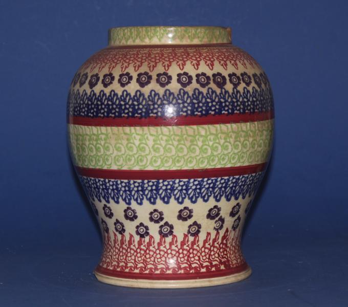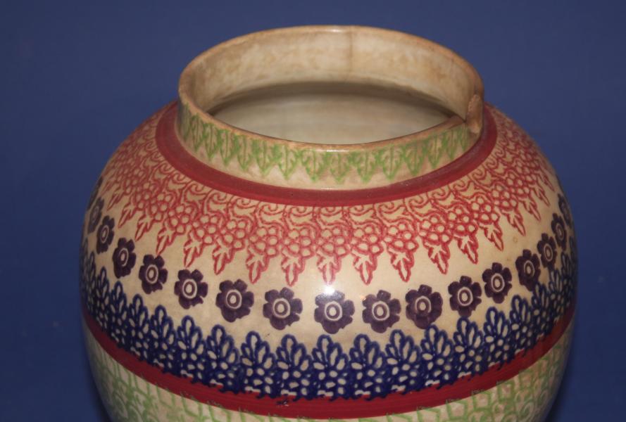 Very rare large piece of sponge ware. Decorated in four colours and including 8 bands of decoration. A very impresive piece.
