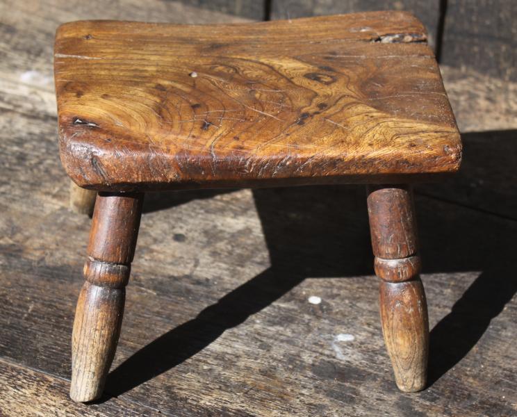 What makes a perfect stool, character ! this one stands straight but look at those legs, three short and one long, with a great piece of wood on top.