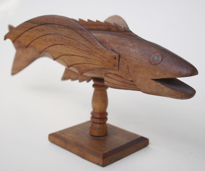 A "standard" fish by this uncommon maker. Typical form with inlayed eyes and applied wings. signed "Greetings from Pitcairn Island Bert Christian.Length33 cm.