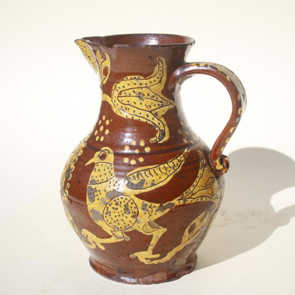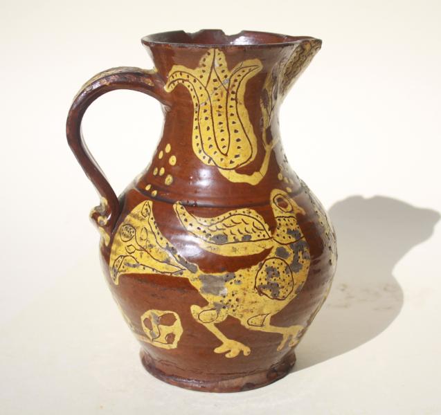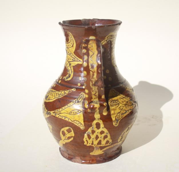 What I find interesting is how rare to find this style of decoration, with the red body having been decorated with a yellow slip design (not dipped) that has been sgraffito'd,. A Devon potter would have dipped the whole jug and then cut out the pattern. |