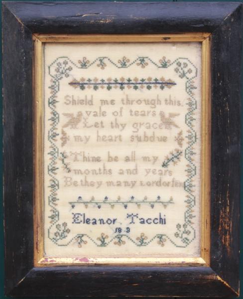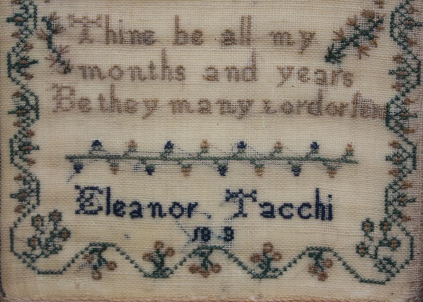Eleanor Tacchi was born in 1829 , and was probably 14(possibly 8) when she completed her sampler . The youngest child (of 10) to Antonio (Anthony) Tacchi, a carver and gilder from Como in Italy who came to England and settled in Bedford (High Street) having married Ann Butcher in 1811. It would appear, as in so many family's the youngest daughter stayed at home to look after her aging parents, who both died in early 1868. Eleanor died in Tetbury in 1897. |